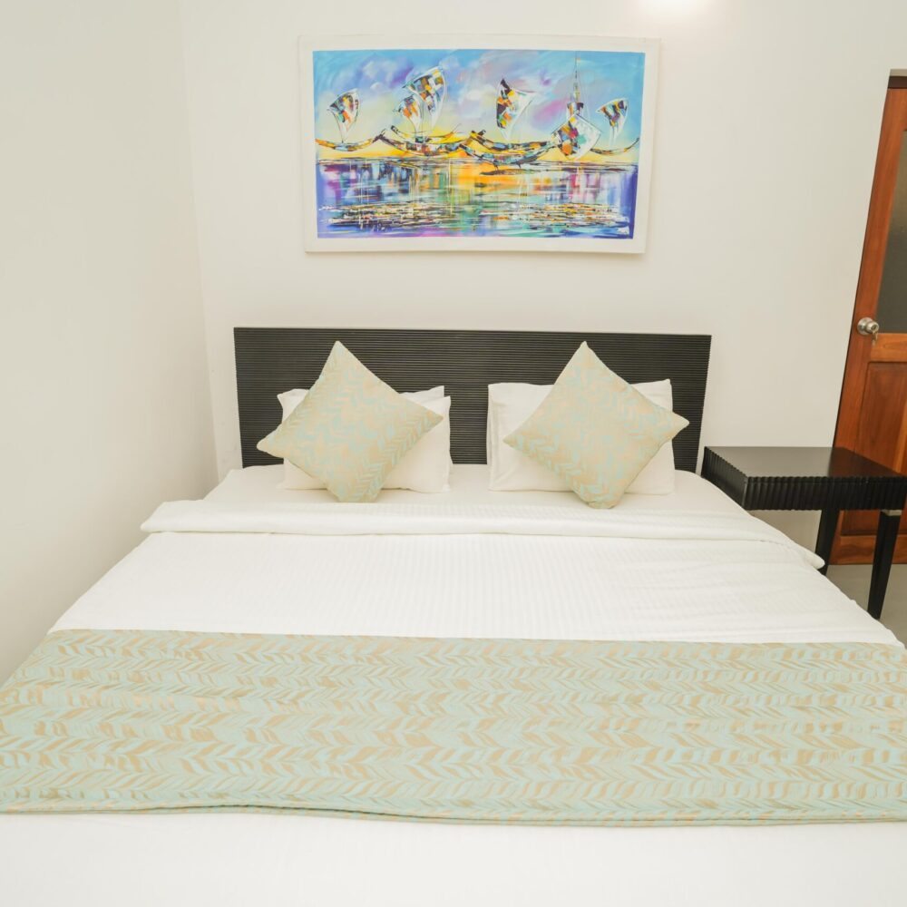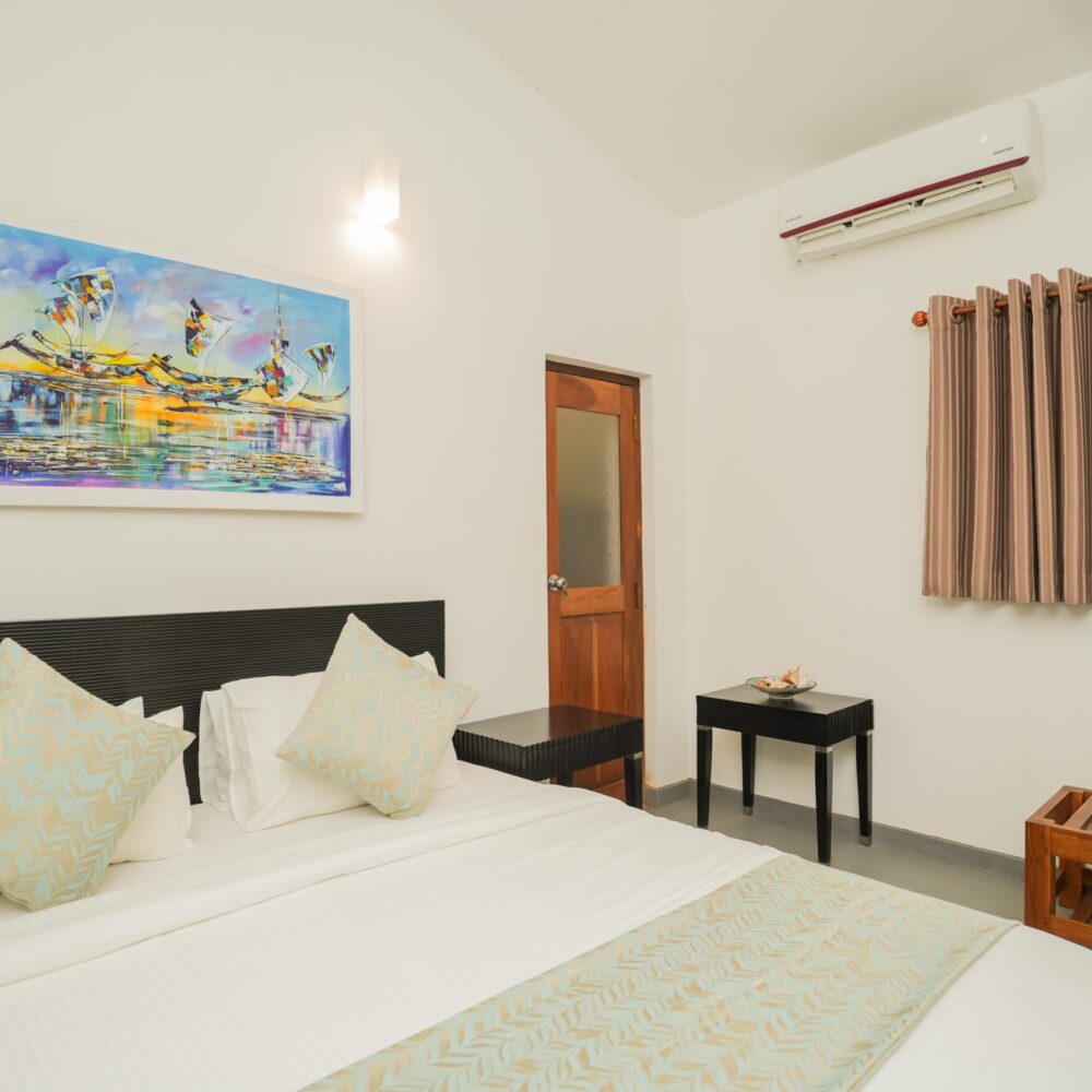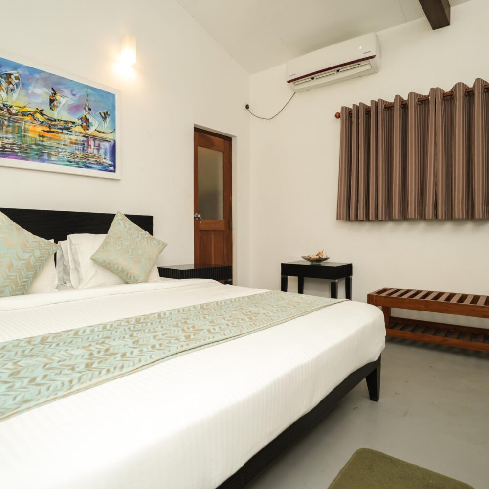 King-sized Bed: Enjoy a restful sleep on a luxurious king-sized bed, adorned with premium linens and plush pillows, ensuring a blissful night’s sleep.